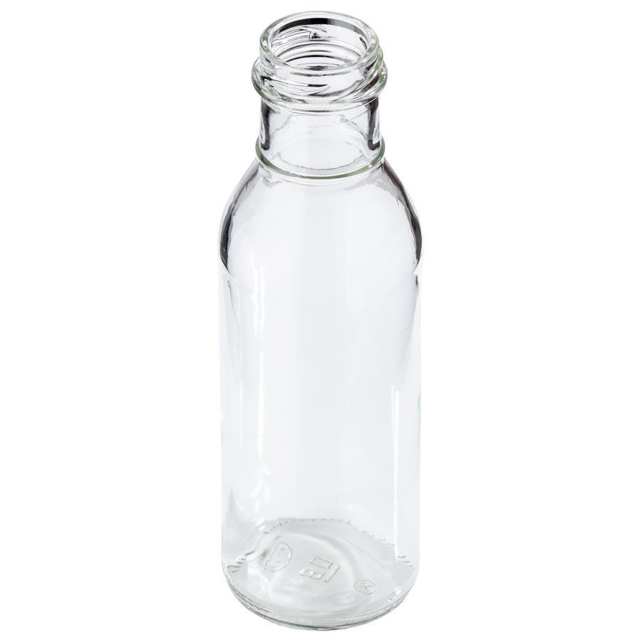 These glass bottles also known as Ring Neck bottles have a tall, slender shape and a ring around their neck that gives it a sleek appearance. This 12 oz clear flint glass bottle has a 38-2000 twist-off thread neck finish and round base. The wide mouth of this bottle is perfect for pouring. The large label panel gives you plenty of space for a creative label, while the round shape makes for easy labeling. This bottle is a perfect option for sauces, dressings and beverages. Note: Metal lug (twist-off) caps ONLY are compatible with twist-off thread jars. Lug caps sold separately.